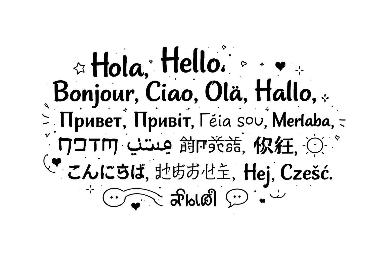 Hola, Hello, Bonjour, Ciao, Olá, Hallo, Hallo, Привет, Привіт, Γεια σου, Merhaba, مرحبا, שלום, नमस्ते, 你好, こんにちは, 안녕하세요, สวัสดี, Hej, Cześć